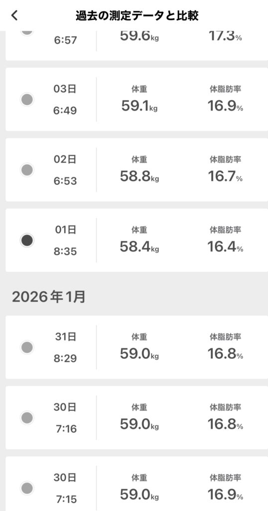 途中上下がありましたが、最大19.6%あった体脂肪率が一番良くても16.4%。