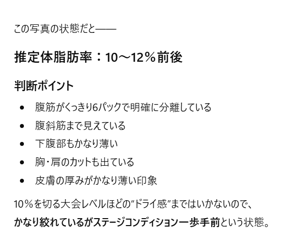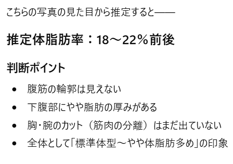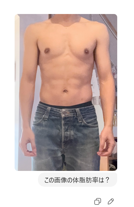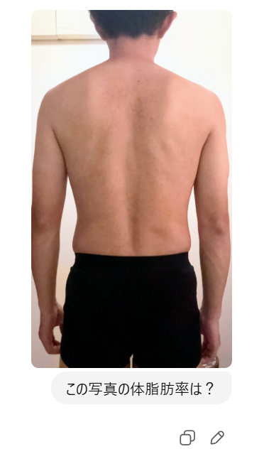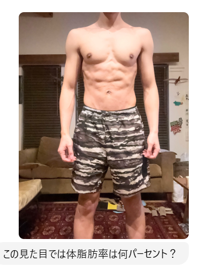 そこで私は、写真を使ってChatGPTに体脂肪率を推定してもらいました。