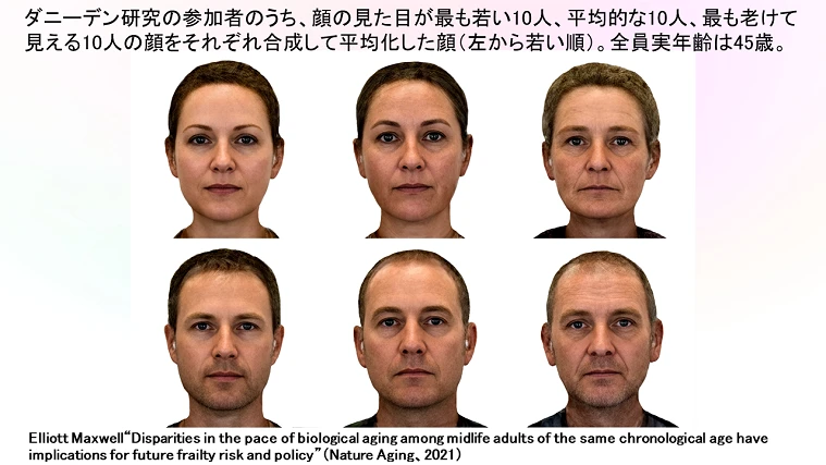 この画像はダニーデン研究に参加した方の顔の見た目が最も若い10人、平均的な10人、最も老けて見える10人の顔をそれぞれ合成したものです。すべて実年齢45歳。明らかに→に進むにつれて老けて見えます。私たちは日常的に人の顔を見ているため、知らず知らずのうちに瞬間的にその人の年齢を推測する癖がついていると思います。しかし「どうやって判断しているの?」と聞かれると即答できる方は少ないはず。